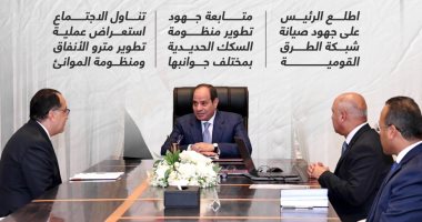 وأشار المتحدث الرسمي إلى أن الرئيس اطلع كذلك على جهود تطوير منظومة السكك الحديدية بمختلف جوانبها، والموقف التنفيذي لعملية تطوير وإعادة تأهيل الخطين الأول والثاني لمترو الأنفاق بالقاهرة الكبرى، بالإضافة إلى العمل الجاري لإنشاء الخط الرابع للمترو، ومستجدات عملية التطوير الجارية لمنظومة الموانئ على مستوى الجمهورية.