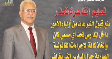 حذر أيمن موسى مدير مديرية التربية والتعليم بالقاهرة، مديرى المدارس من قبول أى تبرعات من أولياء الأمور داخل المدارس تحت أى مسمى، مؤكدا أنه سيتم إتخاذ كافة الإجراءات القانونية الصارمة حيال المدارس التى تخالف هذه التعليمات وتحويل جميع القائمين عليها للتحقيق .