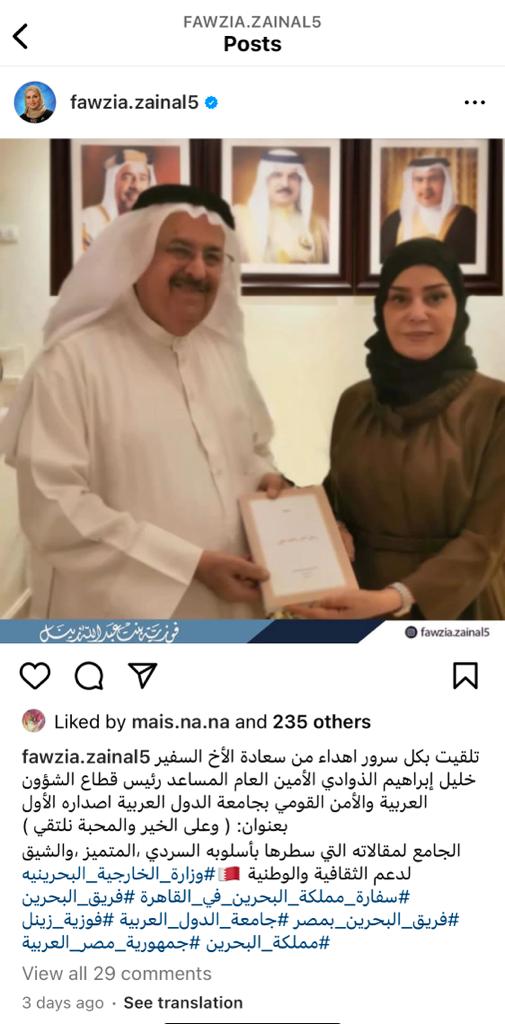 وكتبت عبر صفحتها على موقع التواصل الاجتماعي “إنستجرام”: “تلقيت بكل سرور إهداء من سعادة الأخ السفير خليل إبراهيم الذوادي الأمين العام المساعد رئيس قطاع الشؤون العربية والأمن القومي بجامعة الدول العربية إصداره الأول بعنوان: (على الخير والمحبة نلتقي) الجامع لمقالاته التي سطرها بأسلوبه السردي، المتميز، والشيق، لدعم الثقافة والوطنية”.