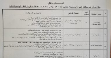 ونوهت المحافظة، أنه فيما يخص الشروط العامة الواجب توافرها بالنسبة للوظائف الهندسية، أن يكون المتقدم حاصلا على بكالوريوس هندسة في تخصص من التخصصات الواردة، وأن يقبل العمل بأي جهة تابعة للمحافظة تراها لمصلحة العمل، وأن يكون من المقيمين داخل نطاق محافظة الجيزة، وأن لا يزيد سن المتقدم عند تقديمه للطلب عن 35 عاما، وأن يكون قد أدى الخدمة العسكرية أو أعلى منها، وأن يكون لديه خبرة سابقة 3 سنوات على الأقل، مع التأكيد على أن العمل بنظام السركي اليومى (أجر مقابل عمل ولا يترتب عليه طلب تثبيت أو تقنين أوضاع أو تحويله إلى عقد دائم أو خلافه) .