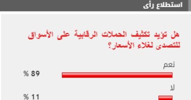 وأيد 89% من القراء مطالب تكثيف الحملات الرقابية على الأسواق للتصدى لغلاء الأسعار، بينما عارض 11% من القراء مطالب تكثيف الحملات الرقابية على الأسواق للتصدى لغلاء الأسعار.
