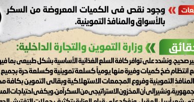 كشف المركز الإعلامى لمجلس الوزراء إنه فى ضوء ما تم تداوله من أنباء بشأن وجود نقص في الكميات المعروضة من السكر بالأسواق والمنافذ التموينية، تواصل المركز مع وزارة التموين والتجارة الداخلية، والتي نفت تلك الأنباء، مُؤكدةً أنه لا صحة لوجود نقص في الكميات المعروضة من السكر بالأسواق والمنافذ التموينية، مُشددةً على توافر كافة السلع الغذائية الأساسية بشكل طبيعي بما فيها السكر، مع انتظام ضخ كميات وفيرة منها يومياً كسلعة تموينية وكسلعة حرة بجميع الأسواق والمنافذ التموينية وفروع المجمعات الاستهلاكية وبقالي التموين بكافة محافظات الجمهورية، مُشيرةً إلى أن المخزون الاستراتيجي من السكر آمن، ويكفي احتياجات المستهلكين حتى شهر أبريل المقبل، مُؤكدةً على قيام الوزارة بتكثيف حملات التفتيش الدورية على كافة الأسواق، لمنع أي تلاعب بالأسعار أو ممارسات احتكارية على السلع.
