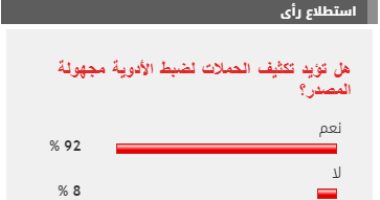 وأيد 92% من القراء مطالب تكثيف الحملات لضبط الأدوية مجهولة المصدر، بينما عارض 8% من القراء مطالب تكثيف الحملات لضبط الأدوية مجهولة المصدر.