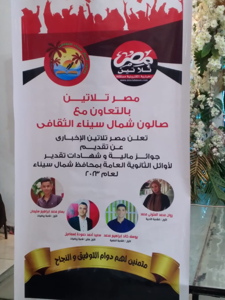 برعايه مصر تلاتين صالون شمال سيناء الثقافي يحتفل بتكريم اوائل الثانويه العامه والثانويه الازهريه والأوائل من ذوي البصيره