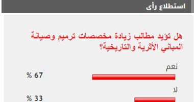 وأيد 67% من القراء مطالب زيادة الدعم المخصص لصيانة وترميم المباني الأثرية والتاريخية، بينما عارض 33% من القراء مطالب زيادة الدعم المخصص لصيانة وترميم المباني الأثرية والتاريخية.