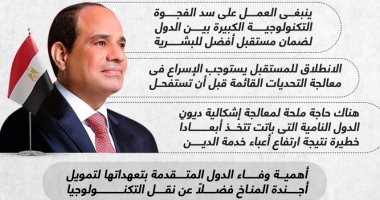 وأشار إلى أن الحديث عن المستقبل، “يدفعنى للإشارة إلى الآمال العريضة المُعلقة على التحول التكنولوجى، لزيادة الإنتاجية، وتوفير فرص جديدة للنمو والاستثمار، إلا أنه، لضمان مستقبل أفضل للبشرية بأسرها، ينبغى العمل على سد الفجوة التكنولوجية الكبيرة بين الدول، وذلك حتى لا يكون التقدم التكنولوجى محركًا إضافيًا لانعدام المساواة”.