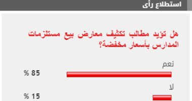 وأيد 85% من القراء مطالب تكثيف معارض بيع مستلزمات المدارس بأسعار مخفضة، بينما عارض 15% من القراء مطالب تكثيف معارض بيع مستلزمات المدارس بأسعار مخفضة.