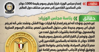 كشف المركز الإعلامى لمجلس الوزراء إنه فى ضوء ما تردد من أنباء بشأن إصدار مجلس الوزراء قراراً بفرض رسوم بقيمة 1000 دولار على السائحين القادمين إلى مصر من مختلف دول العالم، نفى مجلس الوزراء تلك الأنباء، مُؤكدًا أنه لم يتم إصدار أية قرارات بهذا الشأن، مُشدداً على أنه لم يتم فرض أي رسوم جديدة على دخول السائحين لمصر، بخلاف الرسوم السارية والمعمول بها الخاصة بتأشيرات الدخول لعدد من الدول.