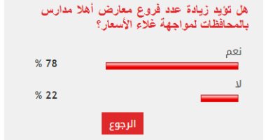 وأيد 78% من القراء زيادة عدد معارض أهلا مدارس لمواجهة غلاء الأسعار، بينما عارض 22% من القراء زيادة عدد معارض أهلا مدارس لمواجهة غلاء الأسعار.