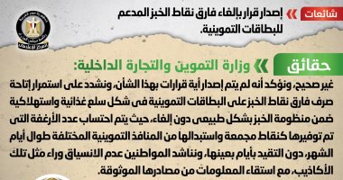 تداولت بعض المواقع الإلكترونية وصفحات التواصل الاجتماعي أنباء بشأن إصدار قرار بإلغاء فارق نقاط الخبز المدعم للبطاقات التموينية، وتواصل المركز الإعلامي لمجلس الوزراء مع وزارة التموين والتجارة الداخلية، والتي نفت تلك الأنباء، مُؤكدةً أنه لا صحة لإلغاء فارق نقاط الخبز المدعم للبطاقات التموينية، وأنه لم يتم إصدار أية قرارات بهذا الشأن، مُشددةً على استمرار إتاحة صرف فارق نقاط الخبز على البطاقات التموينية في شكل سلع غذائية واستهلاكية ضمن منظومة الخبز بشكل طبيعي دون إلغاء، حيث يتم احتساب عدد الأرغفة التي تم توفيرها كنقاط مجمعة واستبدالها من المنافذ التموينية المختلفة طوال أيام الشهر، دون التقيد بأيام بعينها، مُناشدةً المواطنين عدم الانسياق وراء مثل تلك الأكاذيب، مع استقاء المعلومات من مصادرها الموثوقة.