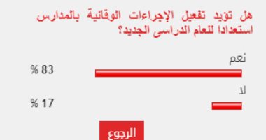 وأيد 83% من القراء تفعيل الإجراءات الوقائية بالمدارس استعدادا للعام الدراسى الجديد، بينما عارض 17% من القراء موضوع الاستطلاع.