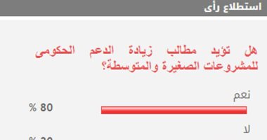 وأيد 80% من القراء الأصوات المطالبة بزيادة الدعم المخصص للمشروعات الصغيرة والمتوسطة، بينما عارض 20% من القراء الأصوات المطالبة بزيادة الدعم المخصص للمشروعات الصغيرة والمتوسطة.