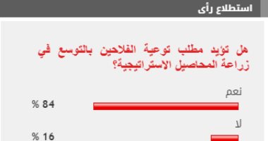 وأيد 84% من القراء مطالب توعية الفلاحين بالتوسع في زراعة المحاصيل الاستراتيجية، بينما عارض 16% من القراء مطالب توعية الفلاحين بالتوسع في زراعة المحاصيل الاستراتيجية.