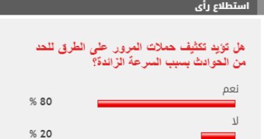 وأيد 80% من القراء مطالب تكثيف حملات المرور على الطرق للحد من الحوادث بسبب السرعة الزائدة، بينما عارض 20% من القراء مطالب تكثيف حملات المرور على الطرق للحد من الحوادث بسبب السرعة الزائدة.