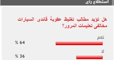 وايد 64% من القراء مطالب تغليظ عقوبة السائقين مخالفى تعليمات المرور، بينما عارض 36% من القراء مطالب تغليظ عقوبة السائقين مخالفى تعليمات المرور.