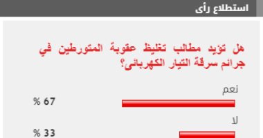 وأيد 67% من القراء مطالب تغليظ عقوبة المتورطين في جرائم سرقة التيار الكهربائى، بينما عارض 33% من القراء مطالب تغليظ عقوبة المتورطين في جرائم سرقة التيار الكهربائى.