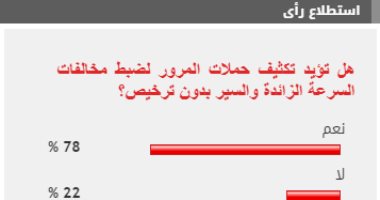 وأيد 78% من القراء مطالب تكثيف حملات المرور لضبط مخالفات السرعة الزائدة والسير بدون ترخيص، بينما عارض 22% من القراء مطالب تكثيف حملات المرور لضبط مخالفات السرعة الزائدة والسير بدون ترخيص.