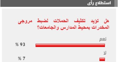 وأيد 93% من القراء مطالب تكثيف الحملات لضبط مروجى المخدرات بمحيط المدارس والجامعات، بينما عارض 7% من القراء مطالب تكثيف الحملات لضبط مروجى المخدرات بمحيط المدارس والجامعات.