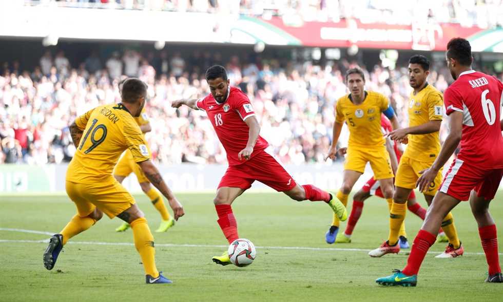 موسى التعمري لاعب الأردن يسدد على مرمى أستراليا