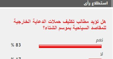 وأيد 83% من القراء مطالب تكثيف حملات الدعاية الخارجية للترويج للمقاصد السياحية خلال فصل الشتاء، بينما عارض 17% من القراء مطالب تكثيف حملات الدعاية الخارجية للترويج للمقاصد السياحية خلال فصل الشتاء.