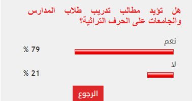 أيد قراءاليوم السابع مطالب تدريب طلاب المدارس والجامعات على الحرف التراثية، حيث أجاب 79 %من القراء بـ” نعم” على استطلاع للرأي طرحه الموقع.