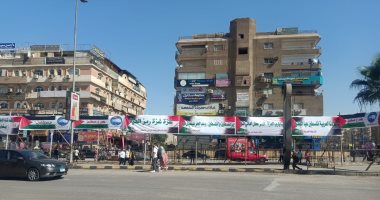 علم فلسطين ولافتات مصر وفلسطين إيد واحدة تزين ميدان الحصرى بأكتوبر
