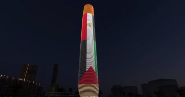 البرج الأيقونى بالعاصمة الإدارية يتزين بعلمى مصر وفلسطين.. فيديو