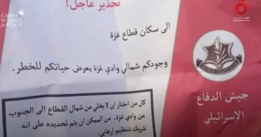 استعرضت قناة «القاهرة الإخبارية»، ما تداوله نشطاء وصحفيون فلسطينيون من قطاع غزة صورة لمنشور تم توزيعه من قِبل جيش الاحتلال الإسرائيلي على المواطنين في شمال قطاع غزة، إذ تقول الصورة: “وجودكم شمالي وادي غزة يعرّض حياتكم للخطر.. كل من اختار ألا يُخلي من شمال القطاع إلى الجنوب من وادي غزة، من الممكن أن يتم تحديده على أنه شريك بتنظيم إرهابي”.