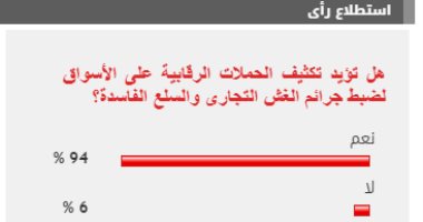 وأيد 94% من القراء مطالب تكثيف الحملات الرقابية على الأسواق لضبط جرائم الغش التجارى والسلع الفاسدة، بينما عارض 6% من القراء مطالب تكثيف الحملات الرقابية على الأسواق لضبط جرائم الغش التجارى والسلع الفاسدة.