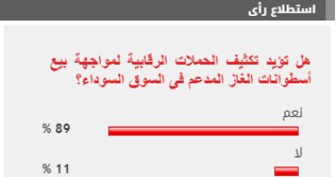 وأيد 90% من القراء مطالب تكثيف الحملات الرقابية لمواجهة بيع أسطوانات الغاز المدعم فى السوق السوداء، بينما عارض 10% من القراء مطالب تكثيف الحملات الرقابية لمواجهة بيع أسطوانات الغاز المدعم فى السوق السوداء.