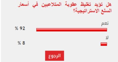 وأيد 92% من القراء مطالب تغليظ عقوبة التجار المتلاعبين في أسعار السلع الاستراتيجية، بينما عارض 8% من القراء مطالب تغليظ عقوبة التجار المتلاعبين في أسعار السلع الاستراتيجية.