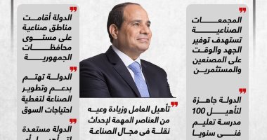 تقديم أى دعم لزيادة الإنتاج.. رسائل الرئيس السيسى بافتتاح المعرض الدولى للصناعة (إنفوجراف)