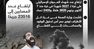 أعلنت الصحة الفلسطينية، ارتفاع عدد شهداء العدوان الإسرائيلي على غزة لـ 9227 شهيدا في غزة منذ 7 أكتوبر بينهم 3826 طفلا و2405 نساء وارتفاع عدد المصابين إلى 23516 .