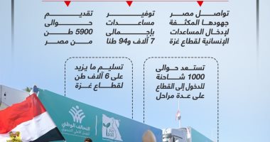 مصر تواصل دعم غزة.. قدمت 5900 طن مساعدات من إجمالى 7 آلاف و94 طنا (إنفوجراف)