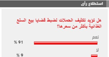 وأيد 91% من القراء مطالب تكثيف الحملات لضبط قضايا بيع السلع الغذائية بأكثر من سعرها، بينما عارض 9% من القراء مطالب تكثيف الحملات لضبط قضايا بيع السلع الغذائية بأكثر من سعرها.