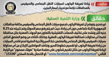 وأكدت وزارة التنمية المحلية، أنه لا صحة لزيادة تعريفة الركوب لسيارات النقل الجماعي والسرفيس بالمحافظات تزامناً مع تحريك أسعار البنزين، مُوضحةً أن تعريفة الركوب لجميع سيارات النقل الجماعي والسرفيس بكافة محافظات الجمهورية ثابتة كما هي دون أي زيادة، حيث لم يتم رفع سعر السولار وتم تثبيته عند 8.25 جنيه للتر، مُشددةً على تكثيف الحملات التفتيشية بالتعاون مع الجهات المعنية بكل محافظة لضبط أي محاولات لمخالفة تعريفة الركوب المقررة، وكذلك للتأكد من وضع الملصق الخاص بسيارات السرفيس والنقل الجماعي والمتضمن خط السير والأجرة المقررة لمنع قائدي السيارات من زيادة تعريفة الركوب أو تقسيم خطوط السير.