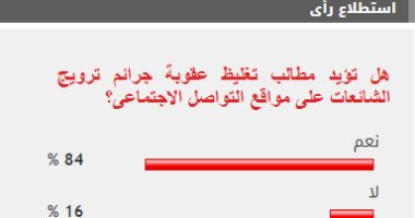 وأيد 84% من القراء مطالب تغليظ عقوبة ترويج الشائعات على مواقع التواصل الاجتماعى، بينما عارض 16% من القراء مطالب تغليظ عقوبة ترويج الشائعات على مواقع التواصل الاجتماعى.
