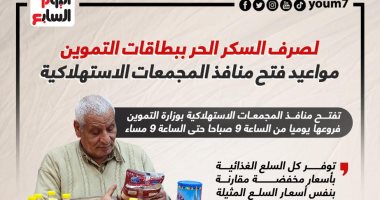 مواعيد فتح منافذ المجمعات الاستهلاكية لصرف السكر الحر ببطاقات التموين.. إنفوجراف