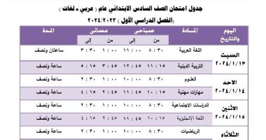 جدول امتحانات الفصل الدراسى الأول للصف السادس الابتدائى بالجيزة