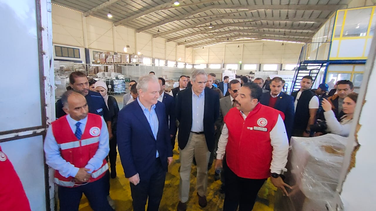 بالصور … وفد الكونجرس يتفقد المساعدات الخاصة بغزة داخل مخازن العريش.