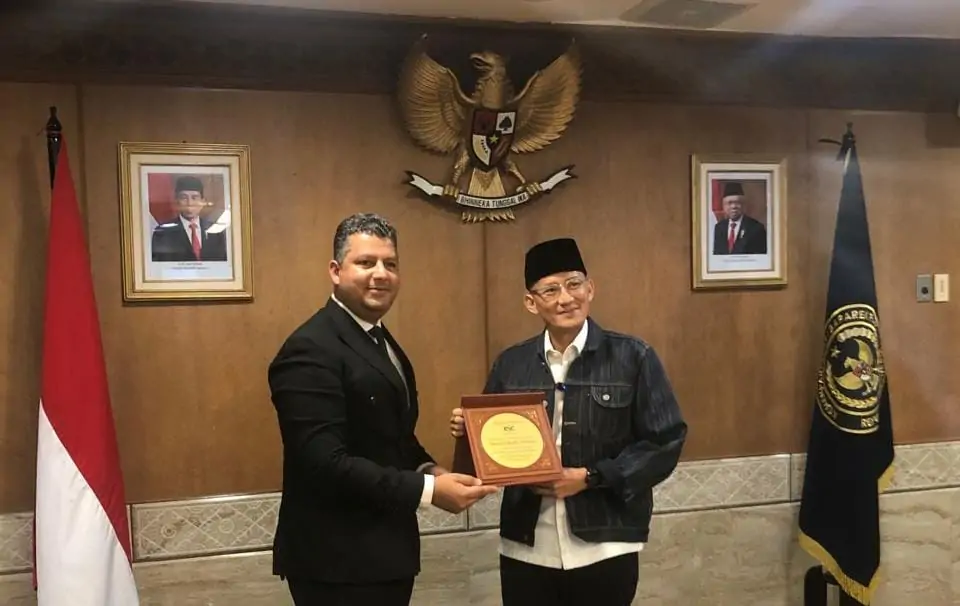 – في إطار حرص البلدين على تنمية وتطوير العلاقات الثنائية، استقبل ساندياجو اونو ، وزير السياحة والاقتصاد الإبداعي الاندونيسي، الدكتور محمد ممدوح ، رئيس مجلس أمناء مجلس الشباب المصري ورئيس اللجنة الاقتصادية بالمجلس القومي لحقوق الإنسان ، بمقر وزارة السياحة والاقتصاد الإبداعي في جاكرتا. بهدف بحث العديد من الموضوعات ذات الصلة بتعزيز التعاون المشترك في مجال السياحة، أهمها:
