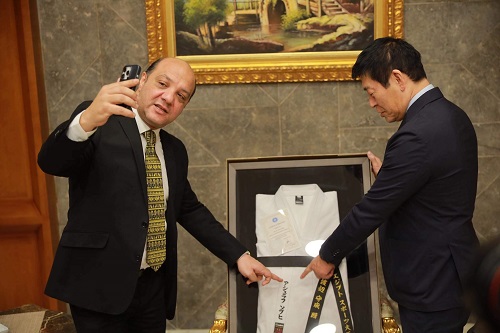رئيس الاتحاد الدولي للجمباز يهدي وزير الرياضة بدلة كاراتيه بالأحرف اليابانية