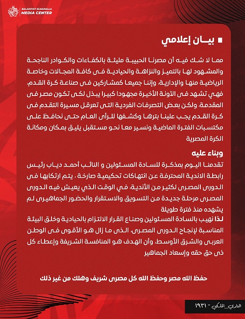 وأصدر نادي البلدية بيان إعلامي نشره على الصفحة الرسمية للنادي على وسائل التواصل الإجتماعي أبدى فيه رفضه للاخطاء التحكيمية التي ظهرت في المباريات الأخيرة بمنافسات الدوري لينضم إلى أندية الزمالك والأهلي وبيراميدز وسيراميكا كليوباترا والتي اعترضت على الحكام في المباريات الأخيرة.