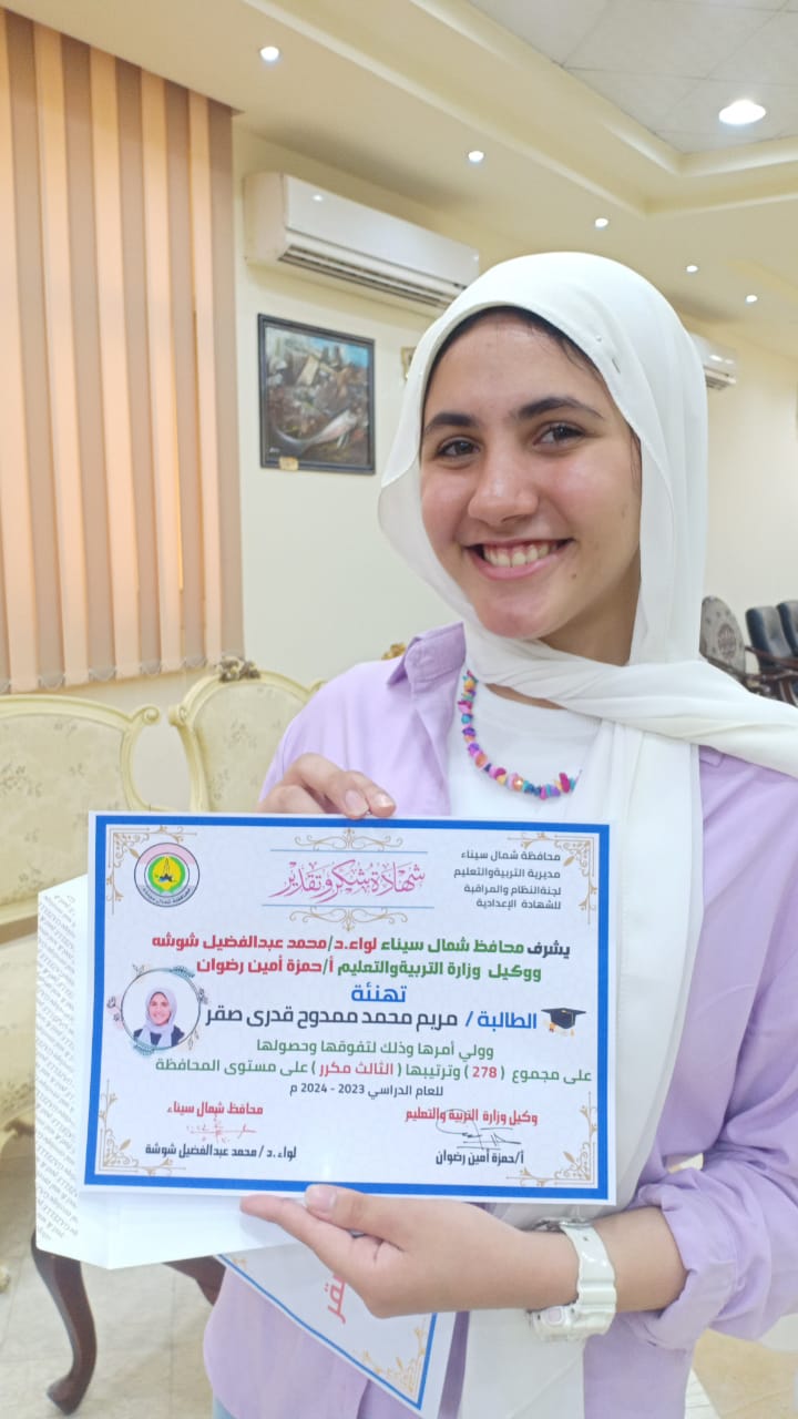 أشار المحافظ الي أن أوائل الشهادة الإعدادية هم كل من، ليلي احمد عبد المجيد، كنزي محمد حمدان سليمان، حسناء حسن كامل، اسما وسام محمود، مرام احمد علي، محمود سعيد محمود، خديجة محمد محمود، عبد الرحمن اسامه احمد، مريم محمد ممدوح صقر ، رواء محمد حسن.