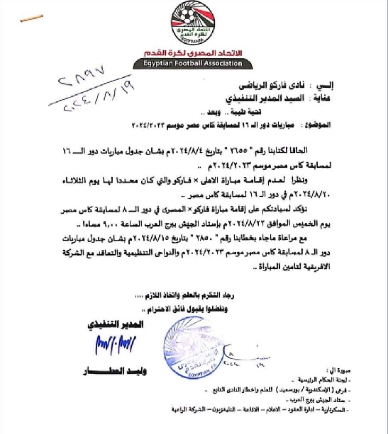 وجاء في الخطاب تحديد موعد مباراة فاركو والمصري في دور الـ8 لكأس مصر.
