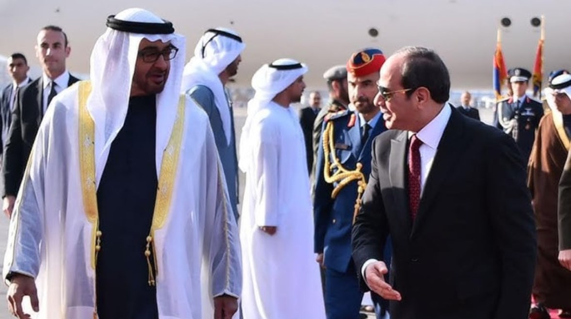 ورحب الرئيس السيسي، خلال استراحة قصيرة في قاعة كبار الزوار في المطار، بالشيخ محمد بن زايد آل نهيان والوفد المرافق في مصر.