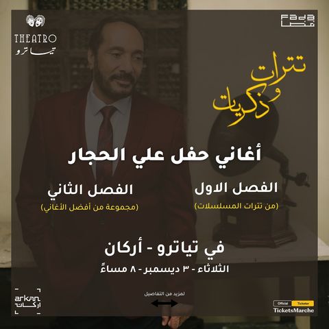 يُحيي الفنان علي الحجار حفلا غنائيا بعنوان “تترات وذكريات”، وذلك في الثامنة مساء الثلاثاء المقبل على مسرح تياترو بإحدى مولات مدينة الشيخ زايد.