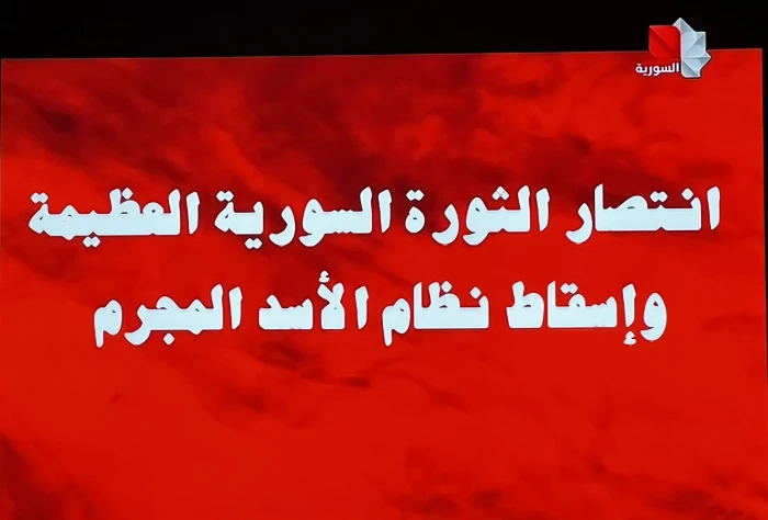 التلفزيون الرسمي السوري يبث صورة كتب عليها “انتصار الثورة السورية العظيمة وإسقاط نظام الأسد المجرم”