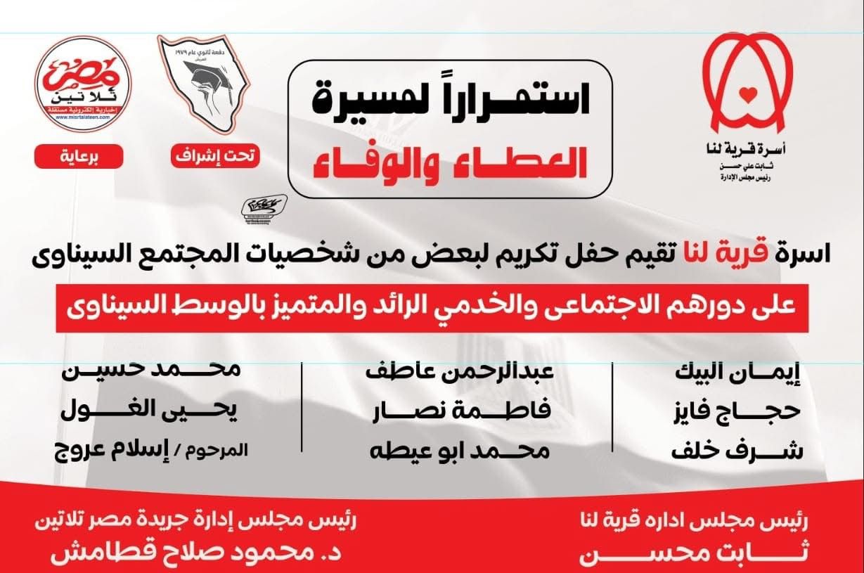 ستقوم قرية لنا ورئيس مجلس ادارتها الاستاذ / ثابت محسن وبالتعاون مع مصر تلاتين ورئيس مجلس الاداره محمود صلاح قطامش وكعادتهم متعاونين في تكريم رموز من ابناء سيناء ومن يشهد لهم بالجهد وخدمه المواطنين بتكريم رموز من المجتمع المدني السيناوي ورعاية بعض الفعاليات الثقافيه بالعريش وذلك في حفل مدعو اليه كل ابناء سيناء وذلك يوم الجمعه الموافق ١٤ ديسمبر ٢٠٢٤ الساعه الخامسه مساء وذلك في قصر بدور بقريه لنا وسيقوم بتنظيم الحفل دفعه ٧٩ ……