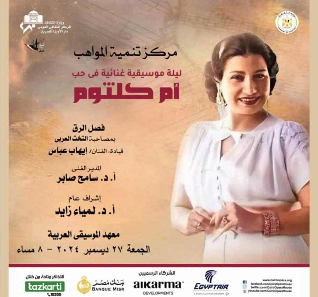 تنظم دار الأوبرا برئاسة الدكتورة لمياء زايد حفلا بعنوان “ليلة موسيقية غنائية في حب أم كلثوم” لطلاب مركز تنمية المواهب تحت إشراف مديره الفنى الدكتور سامح صابر فصل الرق قيادة وتدريب الفنان إيهاب عباس، وذلك في الثامنة مساء الجمعة 27 ديسمبر بمعهد الموسيقى العربية.